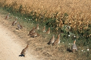 Its steppe origin has allowed the partridge to adapt easily to cereal farmland. Thick vegetation at the base of a hedgerow makes an ideal nest site, and wheat and barley crops provide perfect cover from predators while the young brood is searching for insects.
